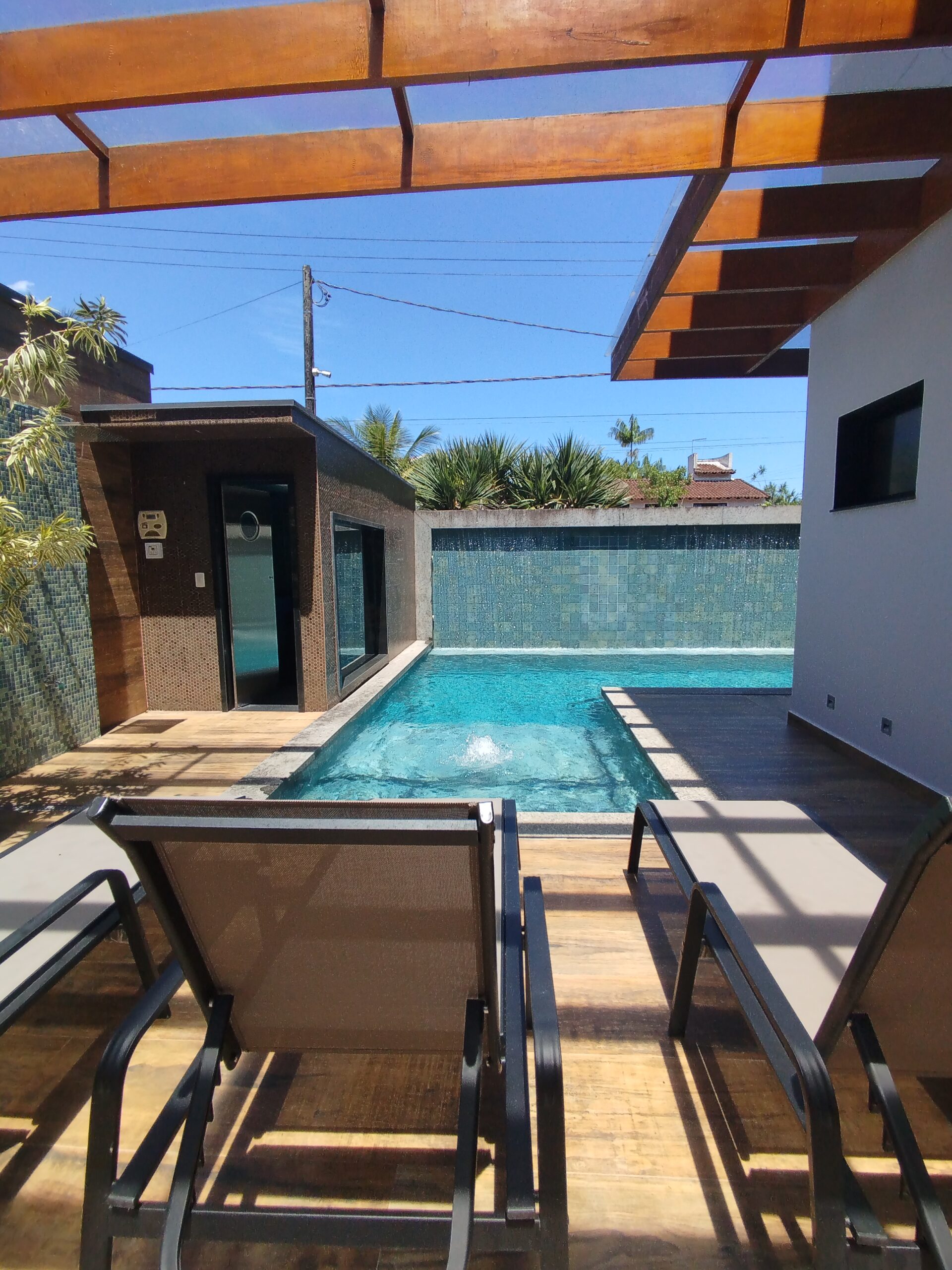 Piscina com pedra esverdeada – visual espetacular e sensação de resort